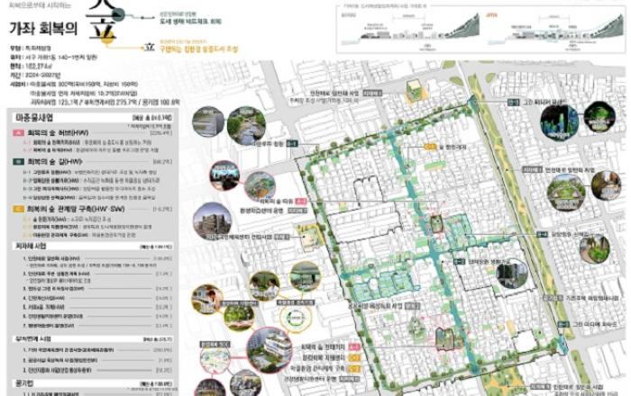 인천광역시장 유정복 시장은 국토교통부가 추진하는 2023년 하반기 도시 재생사업 지역특화 공모에 서구 가좌1동 일원‘가좌 회복의 숲, 환경회복 실증도시’가 최종 선정됐다고 밝혔다. 이번 선정으로 인천시는 국비 150억 원을 확보하게 됐다. 이와 함께 동구의 화수부두 일