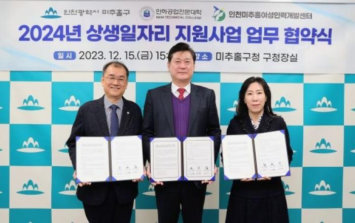 [사진제공=미추홀구청]인천 미추홀구는 15일 구청장실에서 인하공업전문대학(총장 김성찬), 인천미추홀여성인력개발센터(관장 심혜미)와 ‘2024년 상생일자리 지원사업을 위한 업무협약’을 체결했다고 밝혔다.이번 협약은 지난 10월 인천시에서 새롭게 시작하는 ‘상생일자리 지원