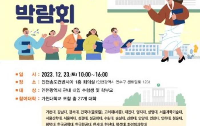 인천시교육청은 관내 대입 수험생과 학부모를 대상으로 2024학년도 대입 정시모집 진학정보 제공을 위한 대학입학 박람회를 송도컨벤시아에서 23일 개최한다.박람회는 이날 오전 10시부터 오후 4시까지 송도컨벤시아 1층 회의실에서 진행할 예정이며 ▶초청 대학별 입학상담 ▶인