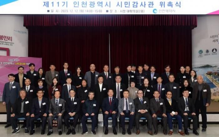 [사진제공=인천시]12일 시청 대회의실에서 제11기 인천시 시민감사관 63명에 대한 위촉식을 개최했다고 밝혔다.이번 시민감사관은 지난 10월 공개모집을 통해 선발했으며, 감사법무, 토목건축, 보건복지 등 총 12개 분야의 전문자격과 실무경험을 갖춘 시민들로 구성됐다.