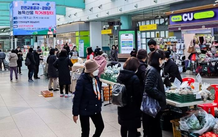 [사진제공=인천교통공사]인천교통공사 김성완 사장은 지난 12월 1일부터 오는 7일까지 일주일간 인천터미널역에서 강화군청과 함께 농특산물 판매 활성화를 위한 ‘제2회 농특산물 직거래장터’를 운영한다고 밝혔다.이번 행사는 지난 11월 4일부터 5일까지 옹진군과 개최한 농수
