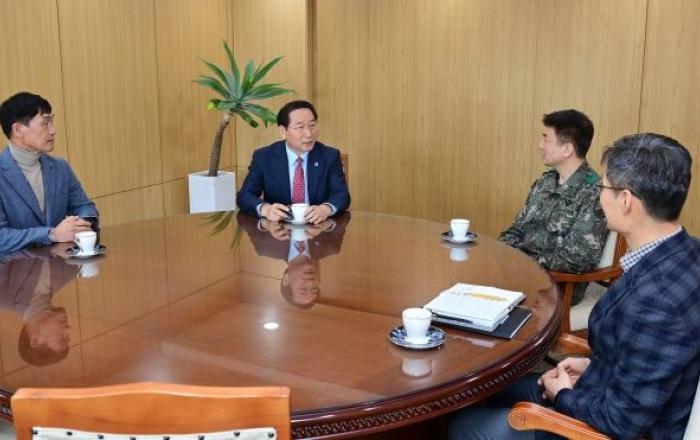 [사진제공=인천시]유정복 인천시장은 12월 4일 시청 소접견실에서 지역군 사령관인 제17보병사단장과 간담회를 열어 안보상황을 청취하고 확고한 통합방위태세 유지를 당부했다고 밝혔다. 이날 간담회는 북한의 정찰위성 발사, 최전방 감시초소(GP) 무장병력 재투입, 서해 해안