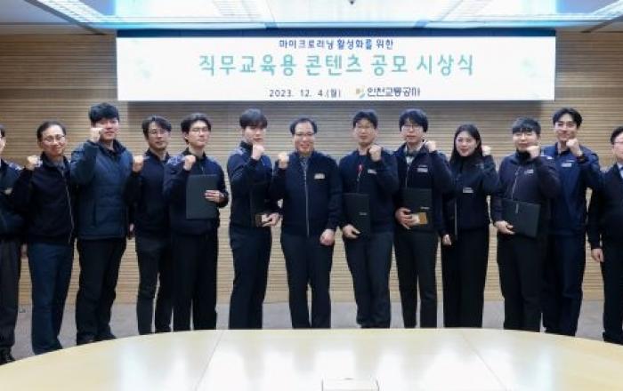 [사진제공=인천교통공사]인천교통공사가 4일 본사에서 마이크로러닝 활성화를 위한 직무교육용 콘텐츠 제작 내부공모 시상식을 진행했다고 밝혔다.공사는 사용자 중심의 직무영상 공모를 통해 조직의 업무관심도를 제고하고, 마이크로러닝 저변확대로 인한 자기주도 상시학습 분위기 조성