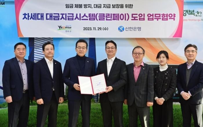 연수구는 29일 구청 소회의실에서 건설공사 하도급 대금을 투명하게 지급하고 대금 체불을 방지하기 위해 신한은행과 '차세대 클린페이' 도입 업무협약을 체결했다. 이번 협약으로 구는 클린페이(전자적 대금지급시스템)를 도입해 건설공사 하도급 대금, 임금, 자재·장비대금