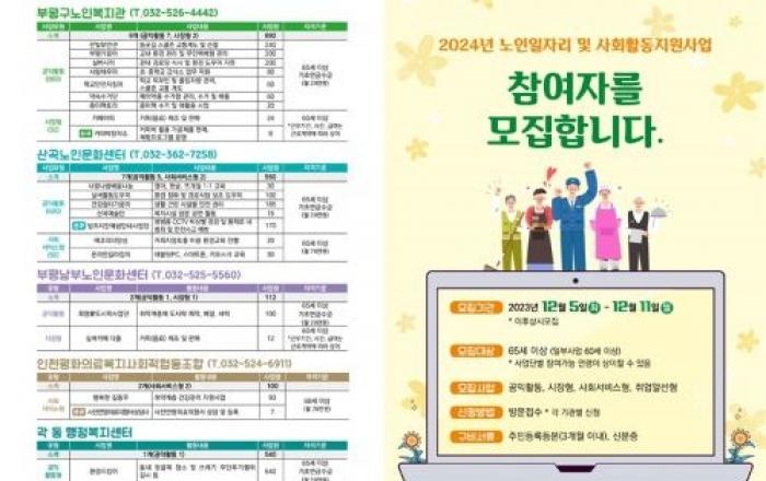부평구가 오는 12월 5일~11일까지 2024년도 노인일자리 및 사회활동 지원사업 참여자를 모집한다.부평구는 구 자체 사업인 우리동네 환경지킴이를 비롯해 부평구노인인력개발센터 등 5개 수행기관과 함께 80개의 노인일자리 사업을 추진한다.특히 신노년 세대라고 불리는 베이