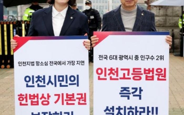 [사진제공=인천시의회]인천시의회에 따르면 허식 의장과 이단비 의원이 지난 13일에 이어 27일과 28일 등 지속적으로 국회를 찾아 ‘인천인천지법 항소심 전국에서 가장 지연, 인천시민의 헌법상 기본권 보장하라’, ‘전국 6대 광역시 중 인구수 2위, 인천고등법원 즉각 설