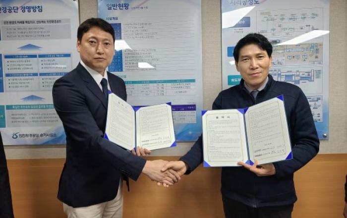 [사진제공=인천환경공단]인천환경공단 승기사업소는 ㈜오토바이오그래피와 29일 사업소 소장실에서 하수처리시설 ‘누유 차단형 교반기 전용 구동 감속기 국산화 개발’ 공동연구 업무협약을 체결했다.이번 협약에는 ▲공동연구 및 기술지원 ▲공동연구를 통한 개발품 기술정보 공유 ▲공