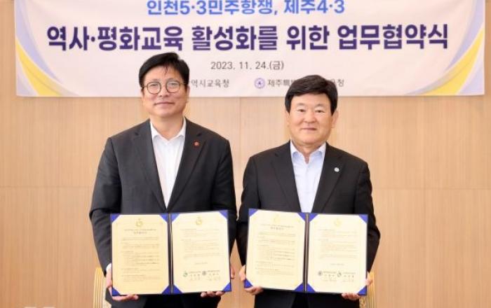[사진제공=인천시교육청] 도성훈 인천시교육감은 제주특별자치도교육청(교육감 김광수)과 24일 송도센트럴파크호텔에서 인천5‧3민주항쟁과 제주4‧3 역사‧평화교육 활성화를 위한 업무협약을 체결했다고 밝혔다.인천5‧3민주항쟁은 지난 8월 민주화운동기념사업회법 개정에