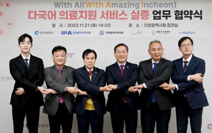 왼쪽부터 이찬형 메디아크 대표이사, 박병근 인천글로벌캠퍼스운영재단 대표이사, 이광래 인천광역시의사회 회장, 유정복 인천시장, 조상일 인천광역시약사회 회장, 권도국 계양구가족센터장 [사진제공=인천시]인천광역시는 11월 21일 시청 접견실에서 ‘With AI(With Am