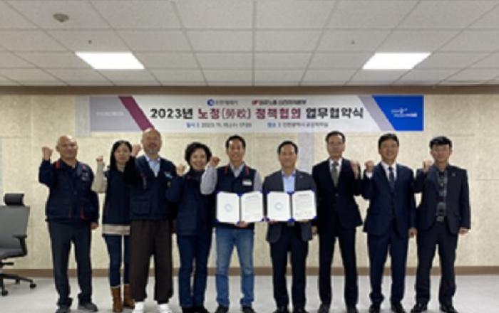 인천시청 회의실에서 15일 민주노총인천지역본부와 노동존중 인천시를 만들기 위한 노정(勞政) 정책협의 업무협약식을 갖고 협력 선언문을 발표했다.이날 협약식에는 박덕수 인천시 행정부시장과 이인화 민주노총인천지역본부 본부장이 참석해 협약을 체결했다.그간 인천시와 민주노총은