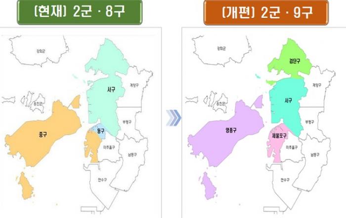 [미래지향적 인천형 행정체제 개편 전도]인천광역시는 최근 열린 국무회의에서 '인천광역시 제물포구·영종구 및 검단구 설치 등에 관한 법률안'을 심의·의결한 후, 대통령의 재가를 받아 국회에 제출했다고 밝혔다.현 2군(郡)·8구(區)를 2군·9구로 바꾸는 인천형 행정체제