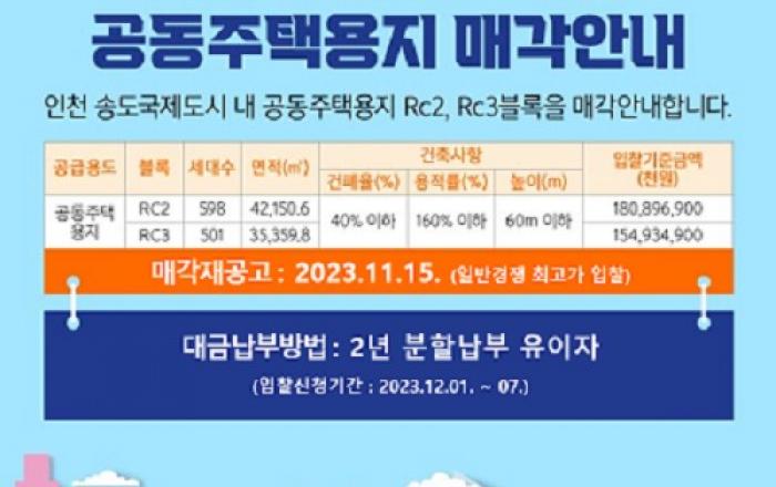 iH는 송도국제도시 11공구 내 공동주택용지를 매각한다고 지난 16일 밝혔다. 매각 대상 2필지(Rc2, Rc3블록)는 송도 11-1공구 2단계에 위치하며, 매립공사는 준공되었으나 기반시설공사가 진행 중인 토지로 실질적인 토지 사용가능 시기는 2025년 하반기다.송도