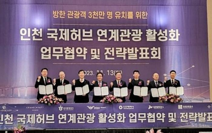 [사진제공 = 인천항만공사]인천항만공사 이경규 사장은 13일 그랜드하얏트 인천 호텔에서 인천광역시, 인천국제공항공사, 한국관광공사, 인천관광공사, 인스파이어인테그레이티드리조트, ㈜파라다이스세가사미, ㈜KAL호텔네트워크와 “인천 국제허브 연계관광 활성화 업무협약”을 체결