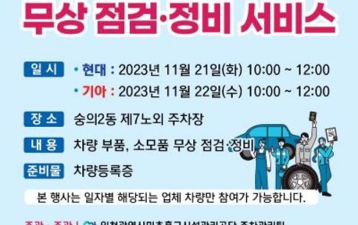 인천 미추홀구시설관리공단는 오는 21일부터 이틀 동안 숭의2동 제7노외주차장에서 겨울철 대비 차량 무상 점검 행사를 진행한다.점검은 오전 10시부터 12시까지 진행하며, 21일에는 현대자동차, 22일에는 기아자동차에서 나와 점검한다.점검 대상은 해당 일자에 점검하는 업