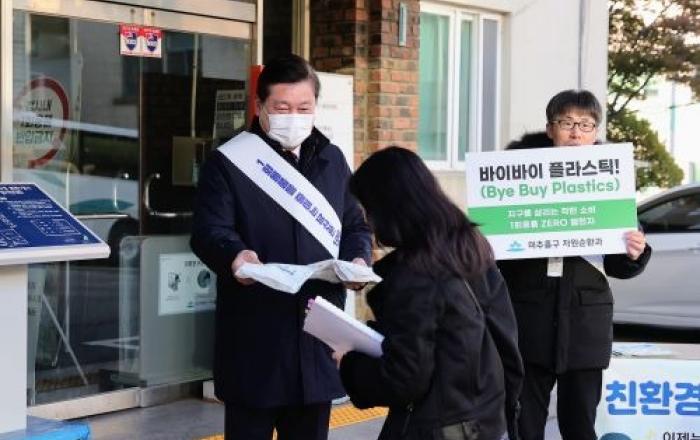 미추홀구 이영훈 구청장은 13일 구청 정문에서 출근하는 직원들을 대상으로 공공부문 1회용품 줄이기 제도의 선도적 역할 수행을 위한 친환경 자원순환 청사 조성 캠페인을 진행했다고 밝혔다.이번 캠페인에서는 1회용품 줄이기 제도 홍보로 텀블러와 에코백을 나눠주면서 사무실 내