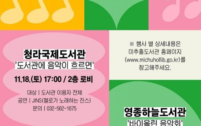 미추홀도서관은 분관인 청라국제·영종하늘도서관에서 11월 특별 공연 ‘도서관에서 즐기는 음악회’를 진행한다고 밝혔다.이번 음악회는 도서관이 지역의 핵심 문화 공간으로서 역할을 맡고 도서관을 찾는 인천시민에게 다양한 문화 향유의 기회를 제공하기 위해 기획됐다. 청라국제도서