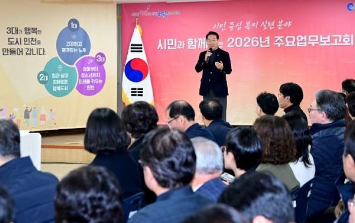 인천시는 11월 28일 인천여성가족재단에서 ‘시민 중심 복지 실현’분야 2026년 시민과 함께하는 주요업무보고회를 개최했다고 밝혔다.▲ 유정복 인천시장이 28일 부평구 인천여성가족재단에서 열린 '시민과 함께하는 2026년 주요업무보고회(시민중심 복지실현 분야)