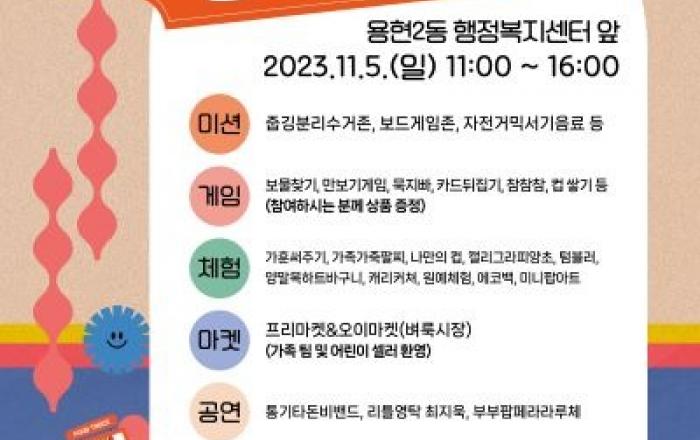 인천도시공사(iH)는 용현2동 행정복지센터에서‘레-토르 명랑축제’를 오는 11월 5일 개최한다고 밝혔다.비룡공감2080 도시재생뉴딜사업의 일환으로 진행하는‘레-토르 명랑축제’는 지난 9월 ‘PLAY 비랑 Ground’와 10월 ‘비랑이꽃동네’에 이은 11월 마을 축제