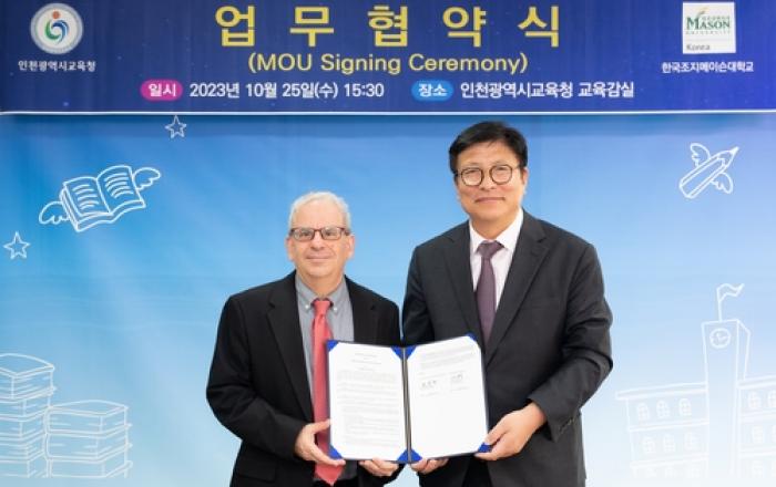 인천광역시교육청은 한국조지메이슨대학교와 인천시교육감 추천 전형을 위한 업무협약을 지난 25일 체결했다. 교육감실에서 열린 협약식에는 도성훈 교육감, 로버트 매츠 한국조지메이슨대 대표, 이미영 동아시아국제교육원장을 비롯해 내외빈 10여 명이 참석했다. 협약은 인천시교