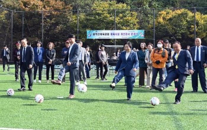 부평구는 지난 25일 원적산체육공원 체육시설 개선 공사 준공식을 개최했다.이날 풋살장에서 열린 준공식에는 차준택 구청장을 비롯해 국회의원 등 지역 의원과 체육회 단체, 지역주민 100여 명이 참석했다.준공식은 경과보고로 시작해 ▲차준택 구청장 기념사 ▲구의회
