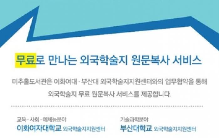 인천광역시 미추홀도서관은 부산대학교 외국학술지 지원센터와의 업무협약을 체결하고 기술과학분야 '외국학술지 무료 원문복사 서비스'를 제공한다고 밝혔다. 미추홀도서관은 지난해 이화여대 외국학술지지원센터와 업무협약을 맺고 교육·사회·예체능 분야 자료를 제공 중인데, 이번
