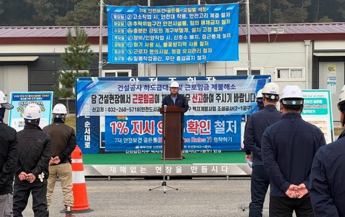 인천도시공사는 건설현장 임금체불로 인한 근로자 및 장비기사의 경제적 어려움을 방지하고자 검단신도시 택지조성공사 현장 근로자를 대상으로 임금체불 예방활동을 실시했다고 밝혔다.이번 건설현장 임금체불 예방활동은 24일 현장 안정 조회에 참여한 검단신도시 택지조성공