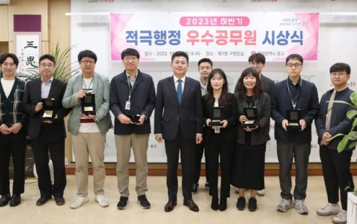 인천시 중구 김정헌 구청장은 지난 23일 구청장실에서 ‘2023년 하반기 적극행정 우수사례 시상식’을 열고, 우수공무원 등에 대해 트로피를 전달했다. 이번에 수상한 우수공무원은 최우수 1명, 우수 2명 장려 3명, 아름다운 도전 1명 총 7명이다. 또 도원동장 등 3명