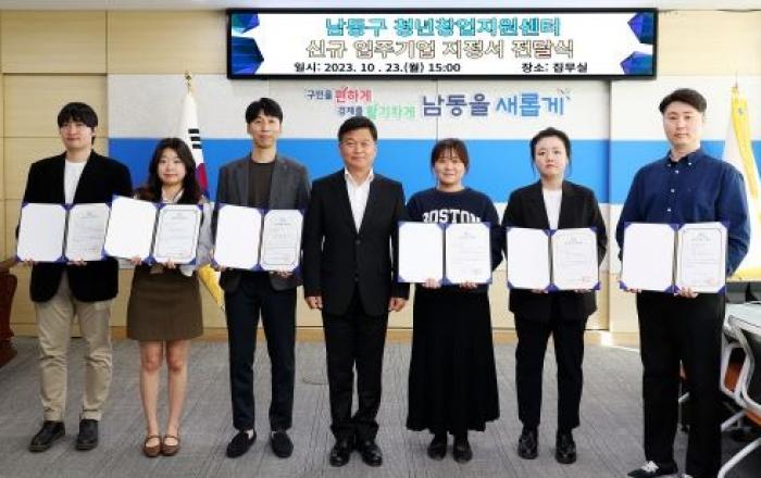 인천시 남동구는 최근 구청장 집무실에서 남동구 청년창업지원센터 신규 입주기업 7개 팀에 입주기업 지정서를 전달했다고 24일 밝혔다. 이번 2023년 하반기 모집에서는 1차 서면 심사와 2차 대면 발표심사를 거쳐 우수한 역량을 가진 초기 및 예비 창업자 7개 팀이 선정