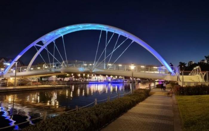 아치보도교[사진제공=인천경제청]송도국제도시 센트럴파크가 밤에도 아름다운 공원으로 변모하고 있다.인천경제자유구역청은 지난 7월 착수한 ‘송도 센트럴파크 교량 경관 조명 개선 사업‘이 최근 준공됐다고 25일 밝혔다. 이번에 경관 조명이 개선된 교량은 △아치보도교, △호수1