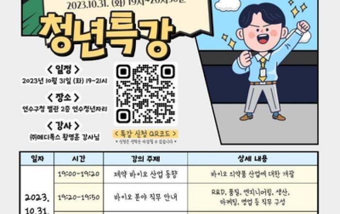 인천 연수구는 오는 10월 31일 구청 별관 2층 연수청년자리에서 바이오 분야 현직자를 초청해 '현직자가 알려주는 바이오산업의 세계'라는 주제로 청년특강을 진행한다. 이번 특강에는 과거 ㈜티엘비코리아 스타트업 창업, 화장품 및 친환경 용기 브랜드 런칭 및 유통에서