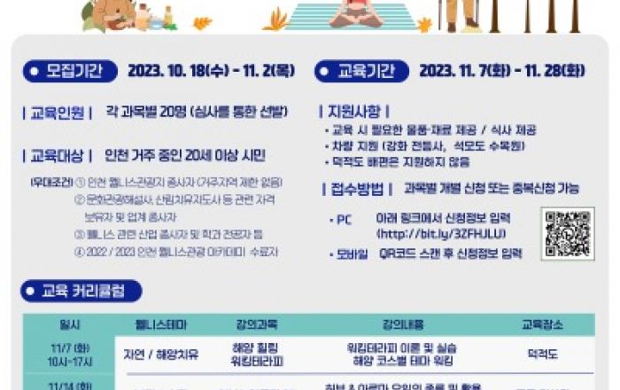 인천광역시와 인천관광공사는 인천 웰니스관광전문 인력양성을 위한 인천 시민 대상 ‘2023 인천 웰니스관광 실무 전문가’ 교육생(80명)을 11월 2일까지 모집한다고 밝혔다.‘인천 웰니스관광 실무 전문가 교육’은 올해 문화체육관광부 공모 사업으로 선정된 ‘인천 웰니스·의