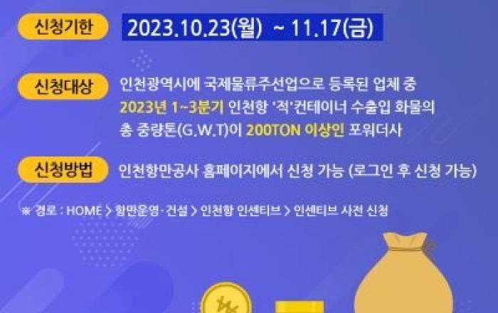 인천항만공사는 인천지역 물류업계 지원을 통한 인천항 물동량 증대를 위해 ‘2023년도 인천시 포워더 인센티브’ 지원기업을 내달 17일까지 모집한다고 밝혔다.2020년 시작한 ‘인천시 포워더 인센티브’는 인천광역시 지원금을 투입해 지난해까지 139개 기업에 총 3억 6,