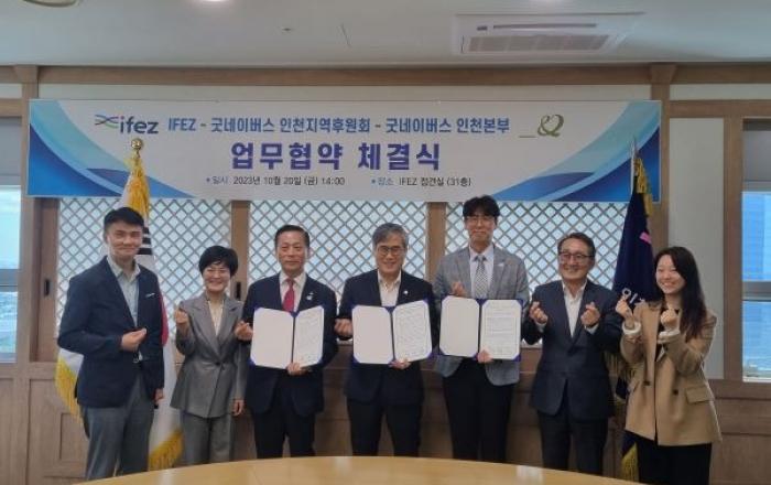[사진제공=인천경제청] 인천경제자유구역청은 지난 20일 송도국제도시 G타워에서 김진용 청장, 유정학 굿네이버스 인천지역후원회장과 홍상진 인천본부장 등이 참석한 가운데 사랑의 연탄 나눔과 관련한 지역사회공헌사업 상호협력 업무협약을 체결했다고 밝혔다.업무협약에 따