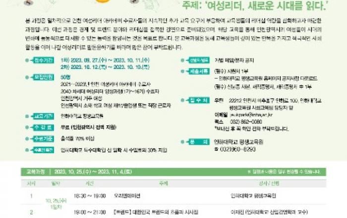 인천광역시는 10월 25일부터 11월 4일까지 매주 수요일과 토요일 8차례 여성리더 아카데미 심화 과정을 개설한다고 밝혔다.‘여성리더, 새로운 시대를 읽다`를 주제로 개설되는 이번 강좌는 기본 과정(5월), 문화 아카데미(7월), 양성평등 아카데미(9월)에 이은 심화