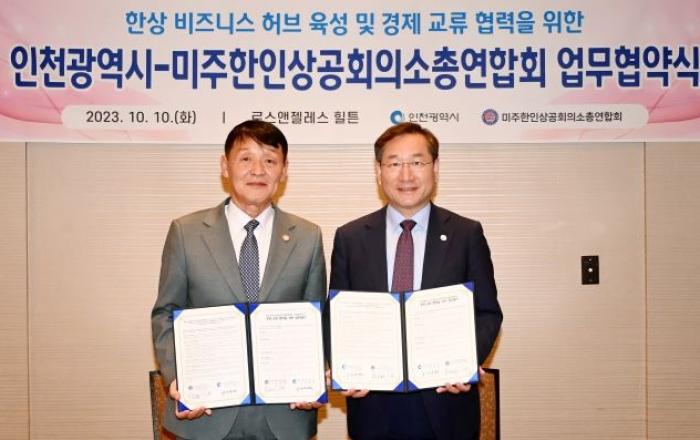 인천시-미주한인상공회의소총연합회 업무협약식[사진출처=인천시]유정복 인천광역시장이 현지 시각 10월 10일 미국 로스앤젤레스(LA)에서 미주한인상공회의소총연합회 이경철 회장과 ‘경제 교류 협력을 위한 업무협약’을 체결했다고 밝혔다. 미주한인상공회의소총연합회는 미주 70여