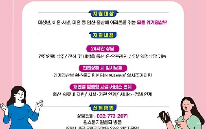 인천광역시는 오는 10월부터 소득 기준, 결혼 여부와 관계없이 모든 임산부들이 건강하게 출산하고 양육할 수 있도록 위기임산부에 대한 임신·출산·양육 원스톱 서비스를 실시한다.최근 출생 미신고·영유아 유기 등이 사회문제로 대두되면서, 인천시는 위기 임산부를 보호하고 위기