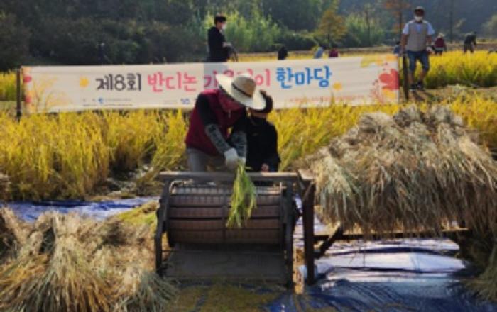 인천광역시는 오는 7일 오전 9시부터 오후 2시까지 인천대공원 습지원 내 반디논에서 가을걷이 한마당을 개최한다고 밝혔다. 벼를 낫으로 베고 홀태와 탈곡기를 활용한 전통 방식의 가을걷이를 체험할 수 있으며 멸종위기종인 금개구리와 맹꽁이 서식지도 방문할 수 있다. 반디논