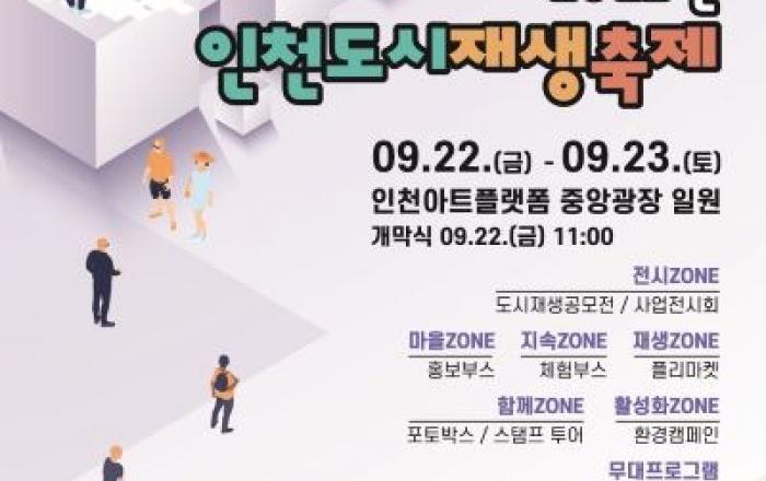 인천광역시 도시재생지원센터는 9월 22일부터 23일까지 인천 아트플랫폼 중앙광장 일원에서‘제3회 인천도시재생축제’를 개최한다고 밝혔다. 이번 축제는 인천 관내 뉴딜 사업지 20곳의 사업 진행현황과 성과를 공유하여 시민들의 도시재생 이해도를 높일 예정이며, 축제홍보페이지