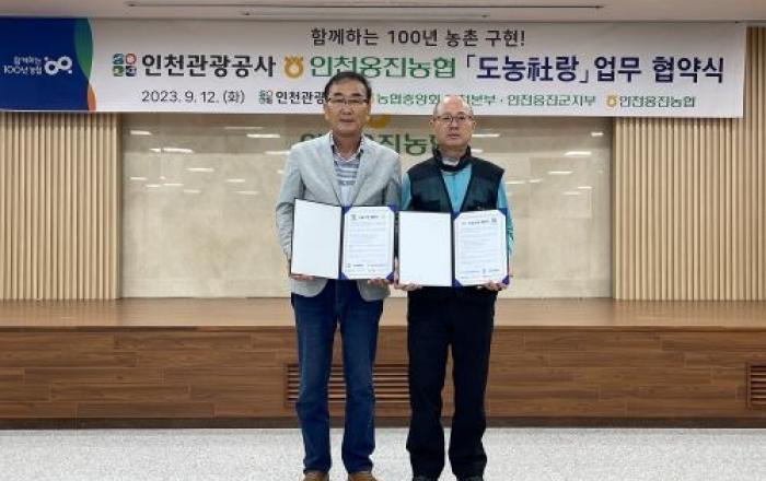 인천관광공사는 9월 12일(화) 인천옹진농협과 도농社랑 업무 협약을 맺은 후, 수확철을 맞아 옹진군 영흥도 소재 포도 농가를 찾아 일손돕기 봉사활동에 참여했다. 일손돕기에 앞서 인천옹진농업협동조합을 방문하여, 상호간 상생협력을 위한 도농사랑 협약을 체결하여 도농교류