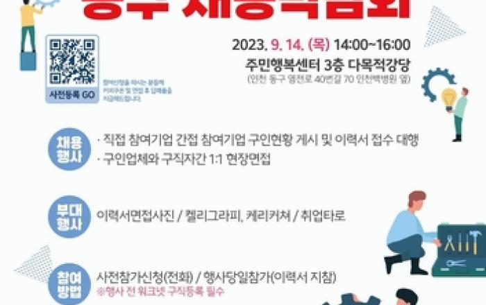 인천 동구는 9월 14일(목) 오후 2시 주민행복센터 3층 다목적 강당에서 '활기찬 동구, 행복한 내일찾기! 뿌리산업과 함께 하는 동구 채용 박람회'를 개최한다고 밝혔다. 이 행사는 고용위기 극복과 고용안정 선제대응 패키지 지원사업의 하나로 인천테크노파크 뿌리일자리