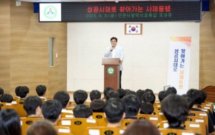 도성훈 인천광역시교육감은 ‘성공시대로 찾아가는 사제동행’의 일환으로 8일 연수구 인천연송고등학교에서 학생대표 60여 명과 함께 소통했다.‘성공시대로 찾아가는 사제동행’은 학생, 학부모, 교직원 등 교육 3주체와의 소통을 확대하기 위해 교육감이 직접 인천교육정책 등에 대