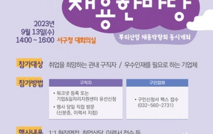 인천 서구는 취업의 어려움을 겪는 구민에게 희망의 바람을 불어넣고자 '2023년 제2회 서구 채용한마당'을 오는 13일 오후 2시 서구청 대회의실에서 개최한다. 이번 행사는 서구, 고용노동부, 인천광역시가 공동으로 주관하며, 직접참여 20개 업체가 채용부스를 운영하