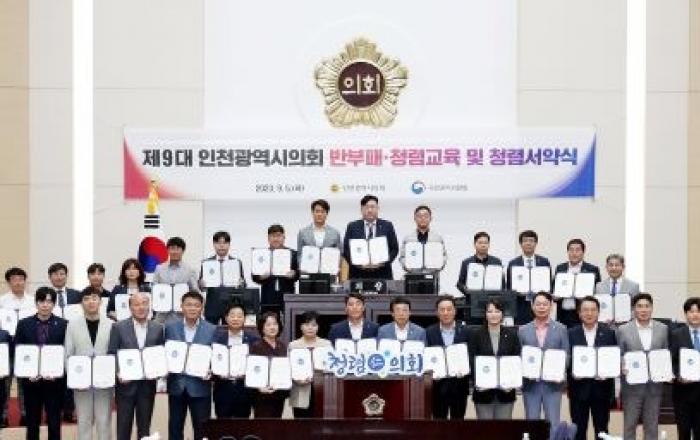 인천광역시의회 의원들이 투명하고 공정한 업무 수행과 청렴한 의회상 구현에 앞장설 것을 다짐했다. 인천시의회는 최근 본회의장에서 청렴 문화 확산과 반부패 의지 함양을 위한 ‘2023년도 반부패·청렴 교육 및 청렴 서약식’을 개최했다고 6일 밝혔다. 이날 또 추석 명절을