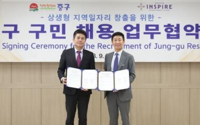인천시 중구청은 ㈜인스파이어 인티그레이티드 리조트와 손을 잡고 구민 일자리 창출 등 지역 상생을 위한 협력의 발판을 마련했다. 김정헌 인천 중구청장과 첸시(Chen Si) ㈜인스파이어 인티그레이티드 리조트 사장은 지난 5일 중구 제2청 대회의실에서 이 같은 내용의 ‘상