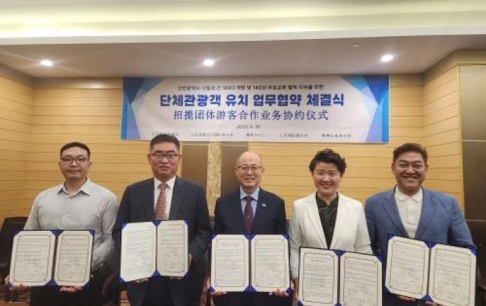[왼쪽부터 프리비아여행사, 어울화장품, 인천관광공사, 산동차요천하국제여행사, 정동국제여행사]인천관광공사는 중국 방한 단체관광 금지 조치 해제(‘23.8.10.)에 따른 한중 관광 회복의 가속화를 예상하여, 중국 전역에서 선박이용 단체관광객이 집결하는 산동성 청도시와 위