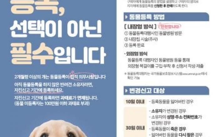 인천 서구청은 9월 말까지 동물등록 자진신고 기간을 운영하고, 자신 신고자에겐 과태료를 면제한다고 밝혔다. '동물보호법'에 따라 주택·준주택에서 기르는 2개월 이상의 개와 그 외의 장소에서 반려를 목적으로 개를 기르는 경우 관할 지자체에 의무적으로 등록해야 하며,