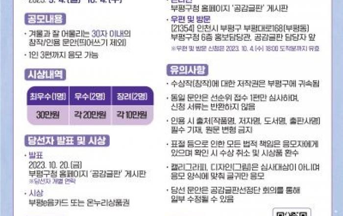 부평구청은 9월 4일부터 10월 4일까지 한 달간 ‘2023년 겨울편 공감글판’ 문안을 공모한다. 이번 공모 대상은 겨울과 어울리면서 구민들에게 사랑과 희망을 전할 수 있는 30자 이내의 창작·인용 글귀다. 인천 시민이거나 인천 소재 직장인, 학생이라면 누구