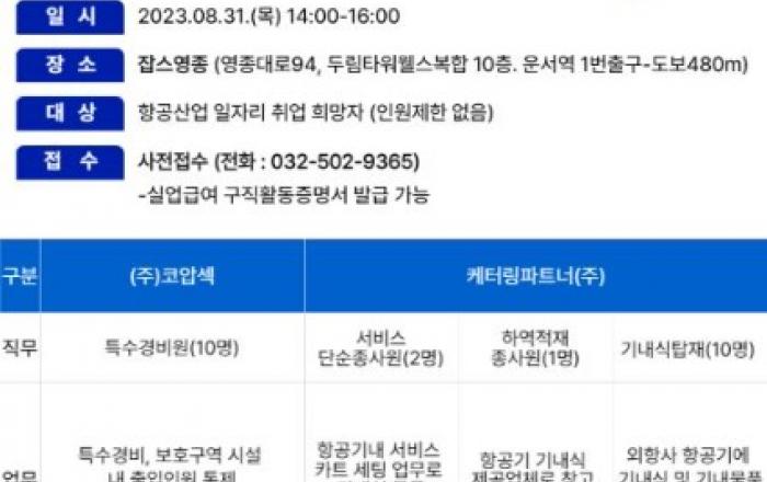 인천시 중구는 오는 31일(목) 영종 일자리센터(중구 영종대로 94 두림타워웰스복합 10층 소재 잡스영종)에서 ‘제8회 항공일자리 구인구직 만남의 날’ 채용행사를 개최한다고 밝혔다. 이번 행사는 항공산업 분야 일자리 확대와 구인난 해소를 목적으로 인천 중구가 주관하고