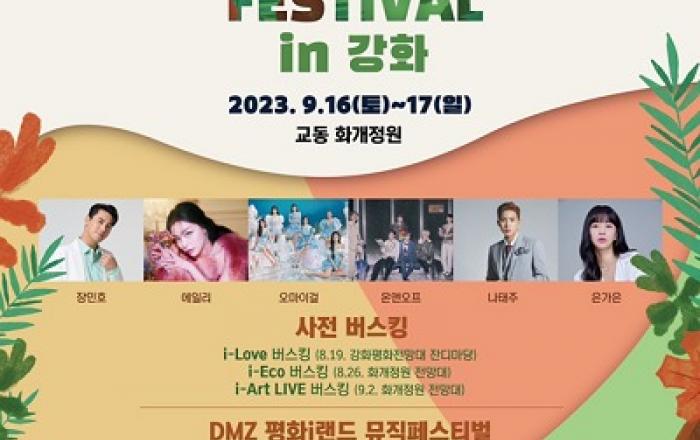‘2023 DMZ평화i랜드 뮤직페스티벌 in강화’가 오는 9월 16일부터 17일까지 교동 화개정원 일대에서 개최된다. 인천광역시와 인천관광공사, 강화군은 비무장지대(DMZ) 접경지역 관광 활성화와 평화의 가치를 알리기 위해 이번 행사를 준비했다.이번 페스티벌은 올해 3