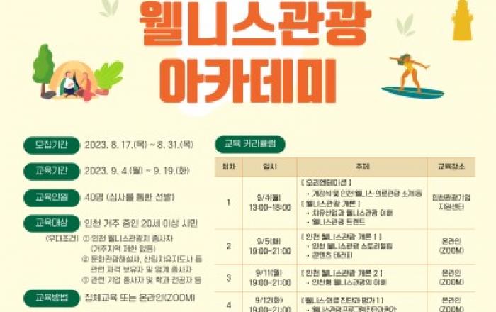 인천광역시와 인천관광공사는 인천 웰니스관광인력양성을 위한 인천 시민 대상 ‘2023 인천 웰니스관광 아카데미’ 교육생(40명)을 8월 31일까지 모집한다고 밝혔다.‘인천 웰니스관광 아카데미’는 인천 웰니스관광지 육성 및 인재양성을 통한 인천 웰니스관광 산업 확대를 위해